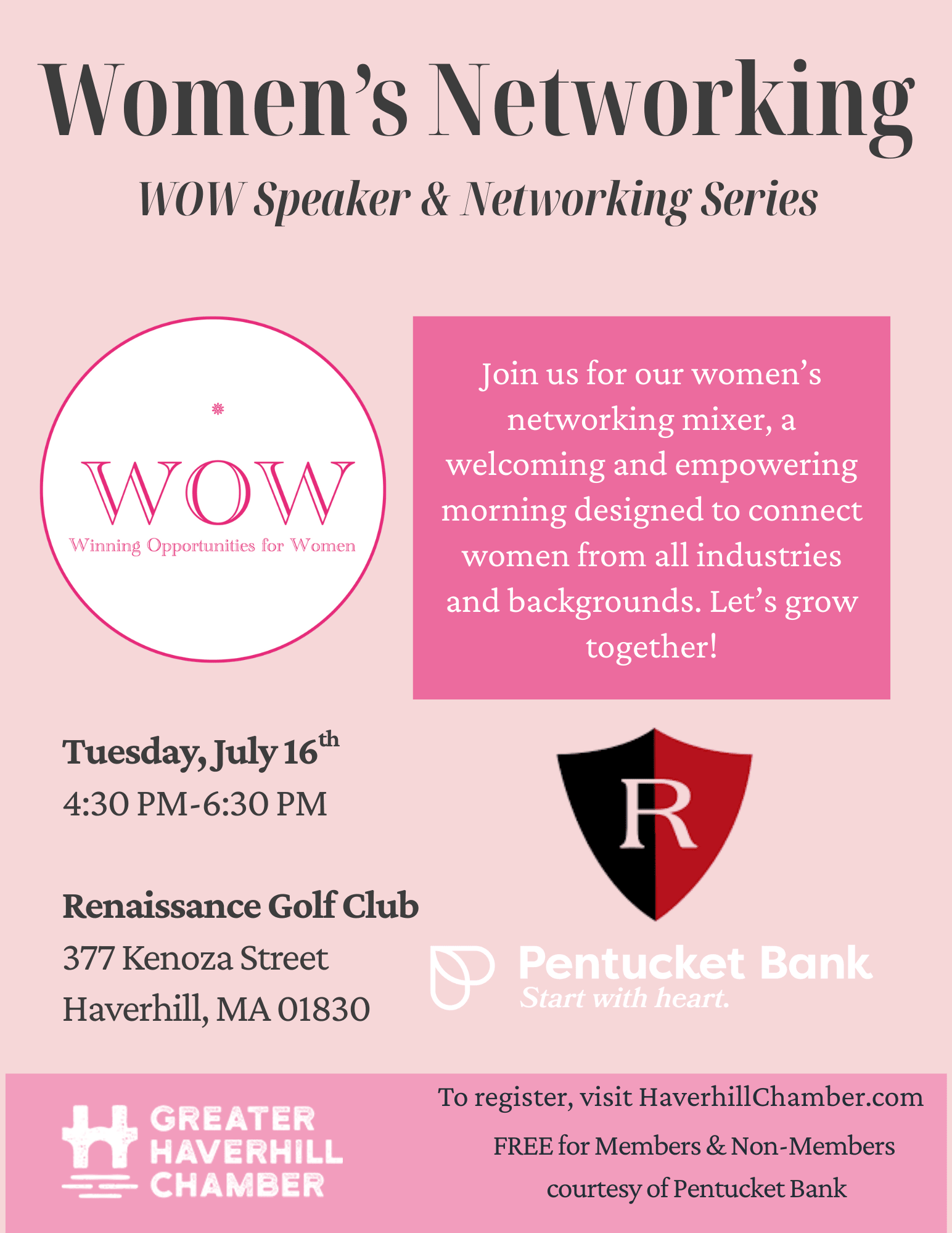 Join us for our women's networking mixer, a welcoming and empowering evening designed to connect women from all industries and backgrounds. Whether you're a business owner, entrepreneur, or professional on the rise, this is your chance to build meaningful relationships, share ideas, and support one another in a relaxed, social setting. Let’s grow together! This new monthly series will take place at the new home of WOW, Renaissance Golf Club.