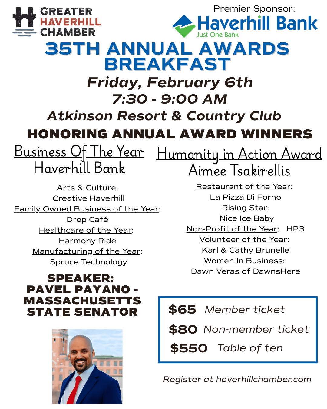 Join us for our 35th Annual Business Awards Breakfast! We invite you to be a part of honoring local business owners and operators who demonstrate service and commitment to their business and the community.