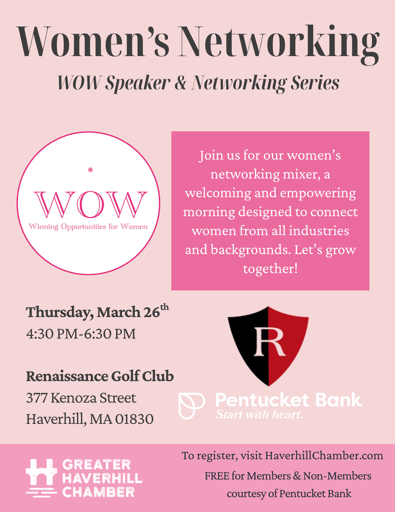 Join us for our women's networking mixer, a welcoming and empowering evening designed to connect women from all industries and backgrounds. Whether you're a business owner, entrepreneur, or professional on the rise, this is your chance to build meaningful relationships, share ideas, and support one another in a relaxed, social setting. Let’s grow together! This new monthly series will take place at the new home of WOW, Renaissance Golf Club.