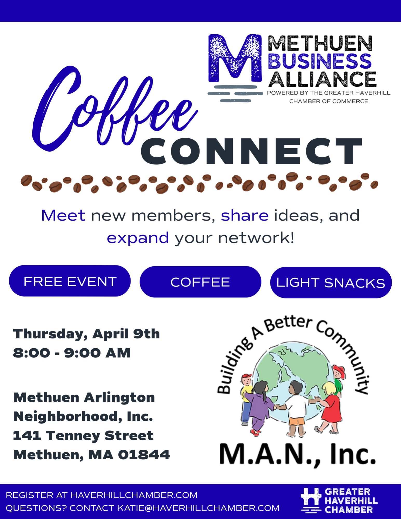 Join us at Methuen Arlington Neighborhood, Inc. for a casual morning networking event to kick-start your day with great coffee and even better conversation. Connect with fellow MBA members, local professionals, and community leaders in a relaxed, welcoming setting. Swing by on your way to work and build new relationships over your favorite brew!