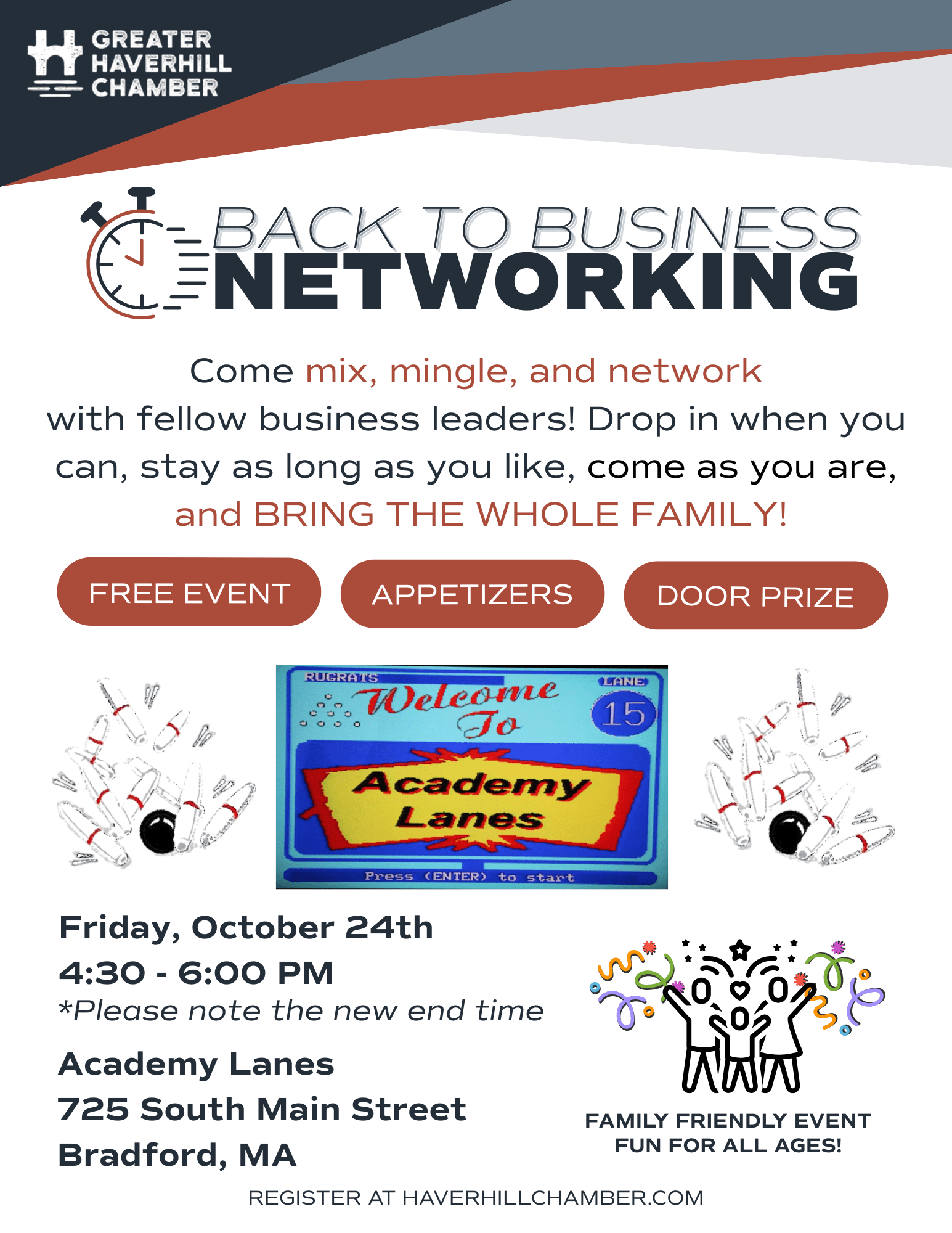 Join us for a Back to Business Networking Night with Academy Lanes! Enjoy delicious complimentary appetizers, a cash bar, and the chance to connect with local professionals, all while enjoying a game of candlepin bowling! FAMILY FRIENDLY AND FUN FOR ALL AGES!