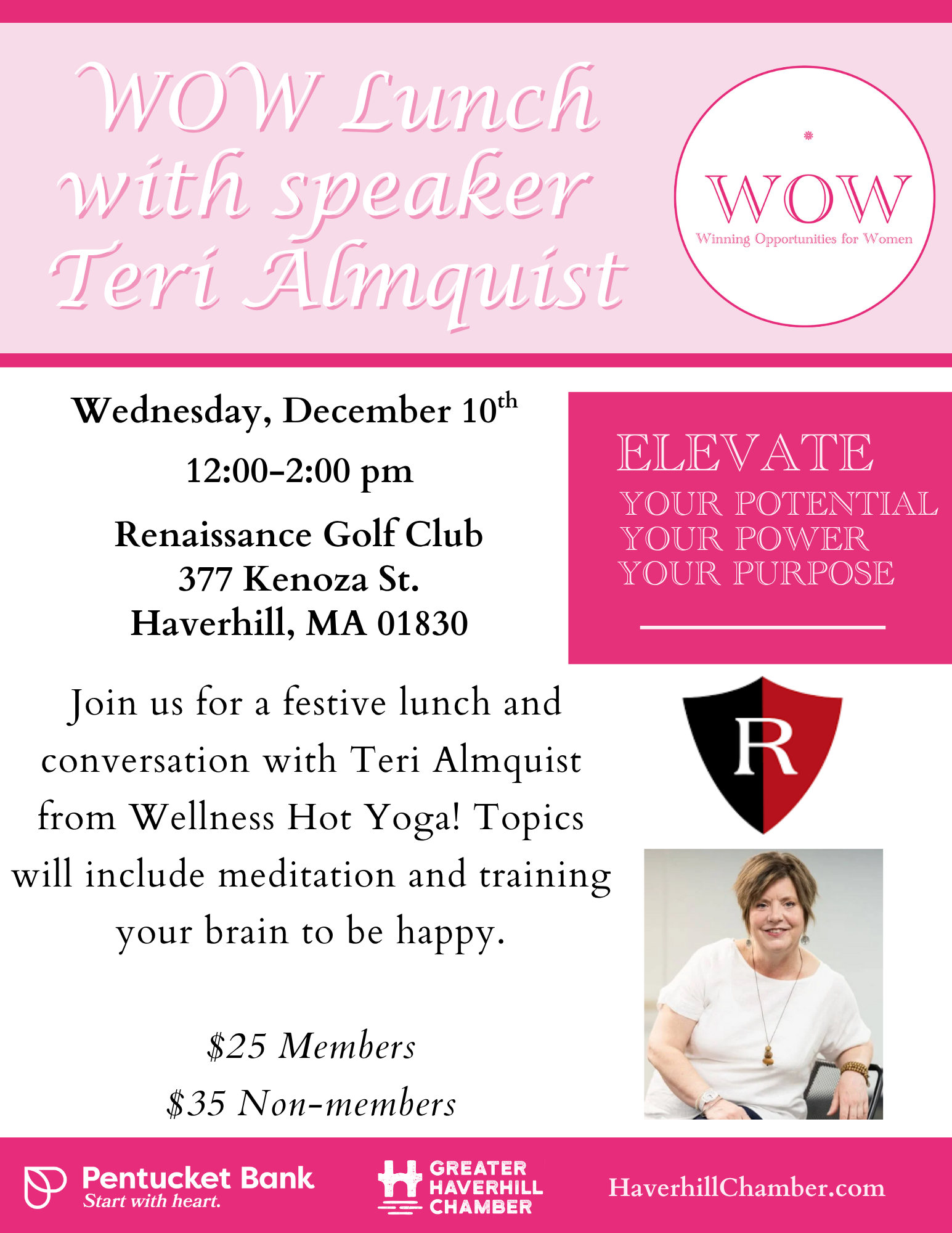 Join us for a festive lunch with Teri Almquist from Wellness Hot Yoga! Topics will include meditation and training your brain to be happy.