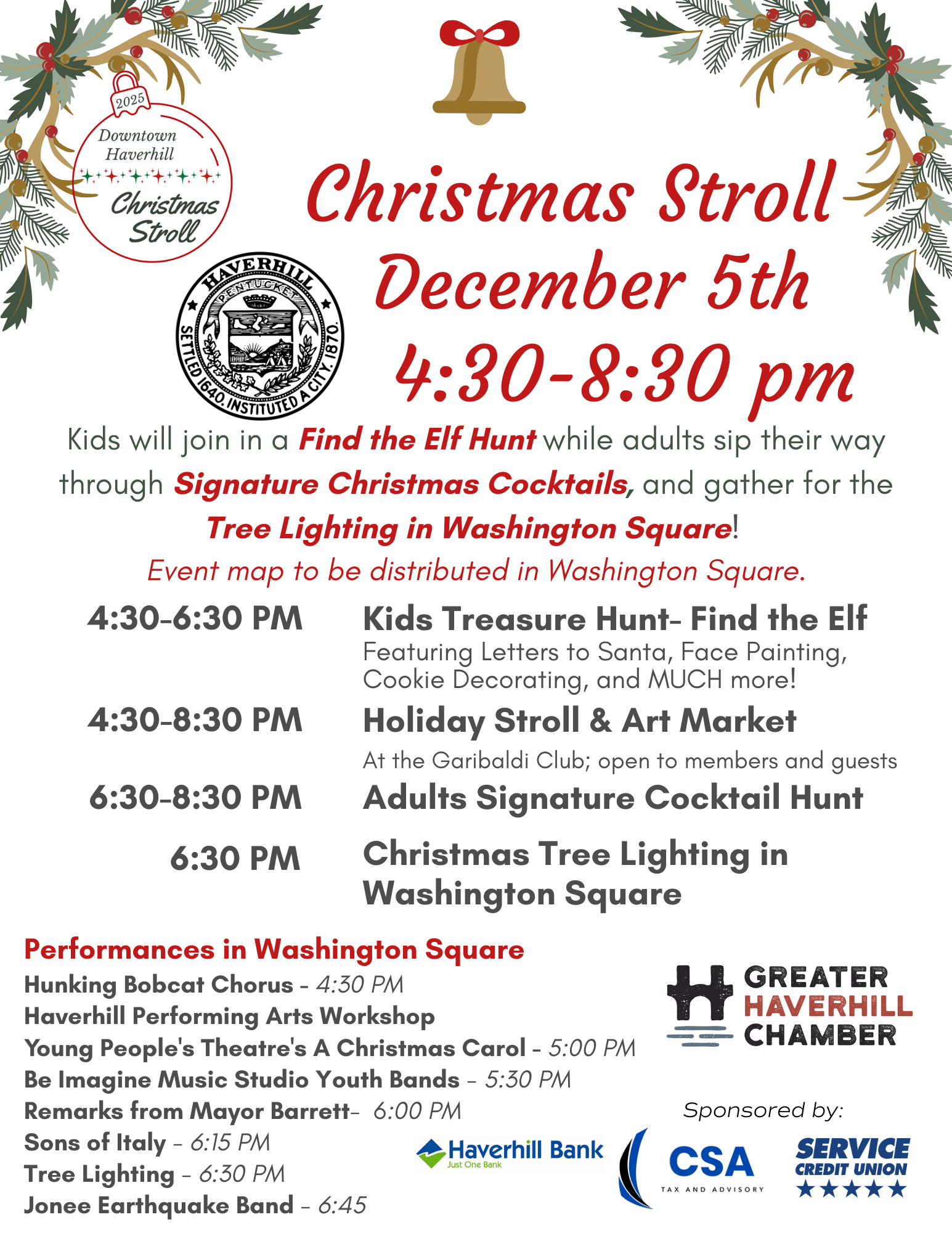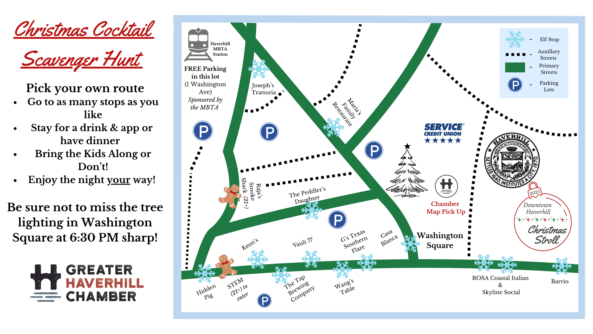 - Physical maps for both the Kids Find-the-Elf & Adult Cocktail Scavenagr Hunt will be available in Washington Square at the Chamber’s table
