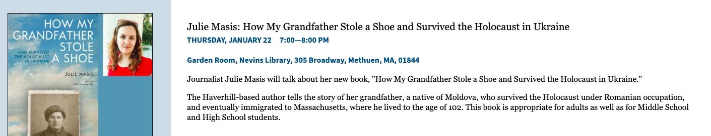 In connection with Holocaust Remembrance Day, Julie Masis, a Haverhill-based author of a new book called "How My Grandfather Stole a Shoe and Survived the Holocaust in Ukraine", will be giving a presentation about her book at the Nevins Library in Methuen on January 22th. The book is about Julie's grandfather, who survived the Holocaust under Romanian occupation, fought in the Red Army, and later immigrated to Massachusetts, where he lived to be 102 years old.